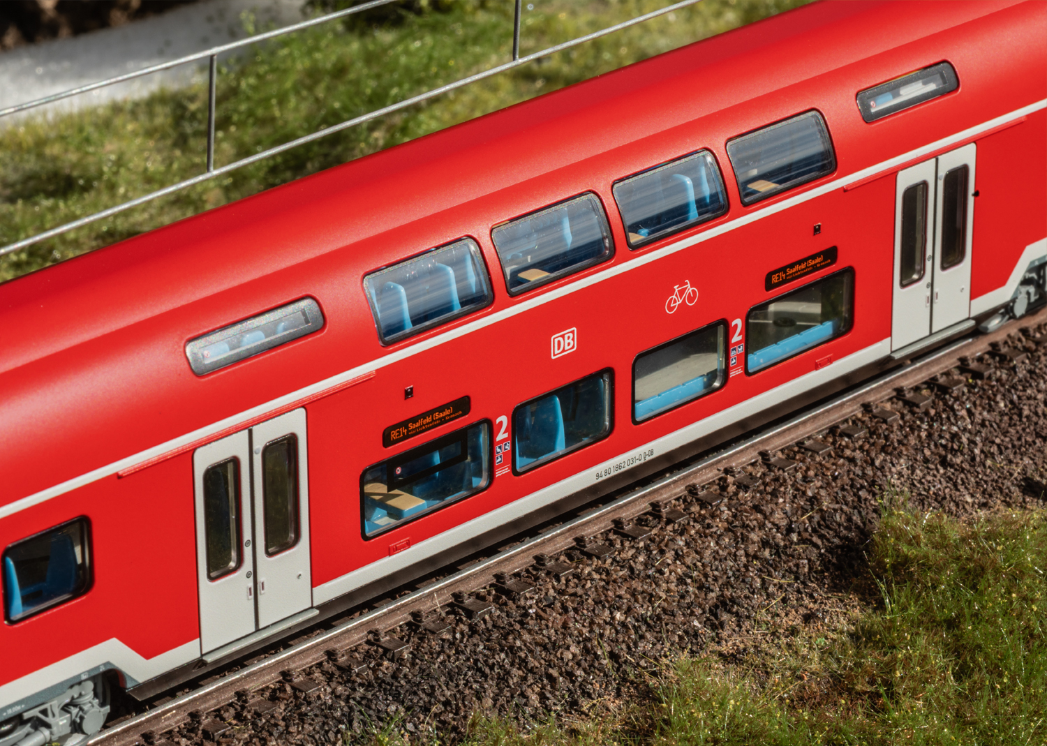 Model: The train has an mfx+ digital decoder and extensive sound and light functions. It also has controlled, high-efficiency propulsion with a flywheel, built centrally into End Car A. All four axles powered in both trucks using cardan shafts. Traction tires. The current supply changes over with the direction of travel and is picked up at the end car at the front of the train. There are special close couplers with a guide mechanism. Triple headlights and dual red marker lights change over with the direction of travel, will work in conventional operation, and can be controlled digitally. There is a double A light function. Long-distance headlights prototypically have two levels of brightness. They, the cab and control desk lighting as well as lighting for the train destination signs at the ends and on the sides can be controlled digitally. There is factory-installed LED interior lighting. A buffer capacitor is built into each car to bridge over temporary spots without current. The interior lighting receives current using the continuous electrical connection for the entire train. Maintenance-free warm white and red LEDs are used for all of the train's lighting. The interior details are multi-colored. The pantographs can be raised and lowered digitally. There are many separately applied details. The minimum radius for operation is 360 mm / 14-3/16". Length of the train approximately 112.6 cm / 44-5/16".