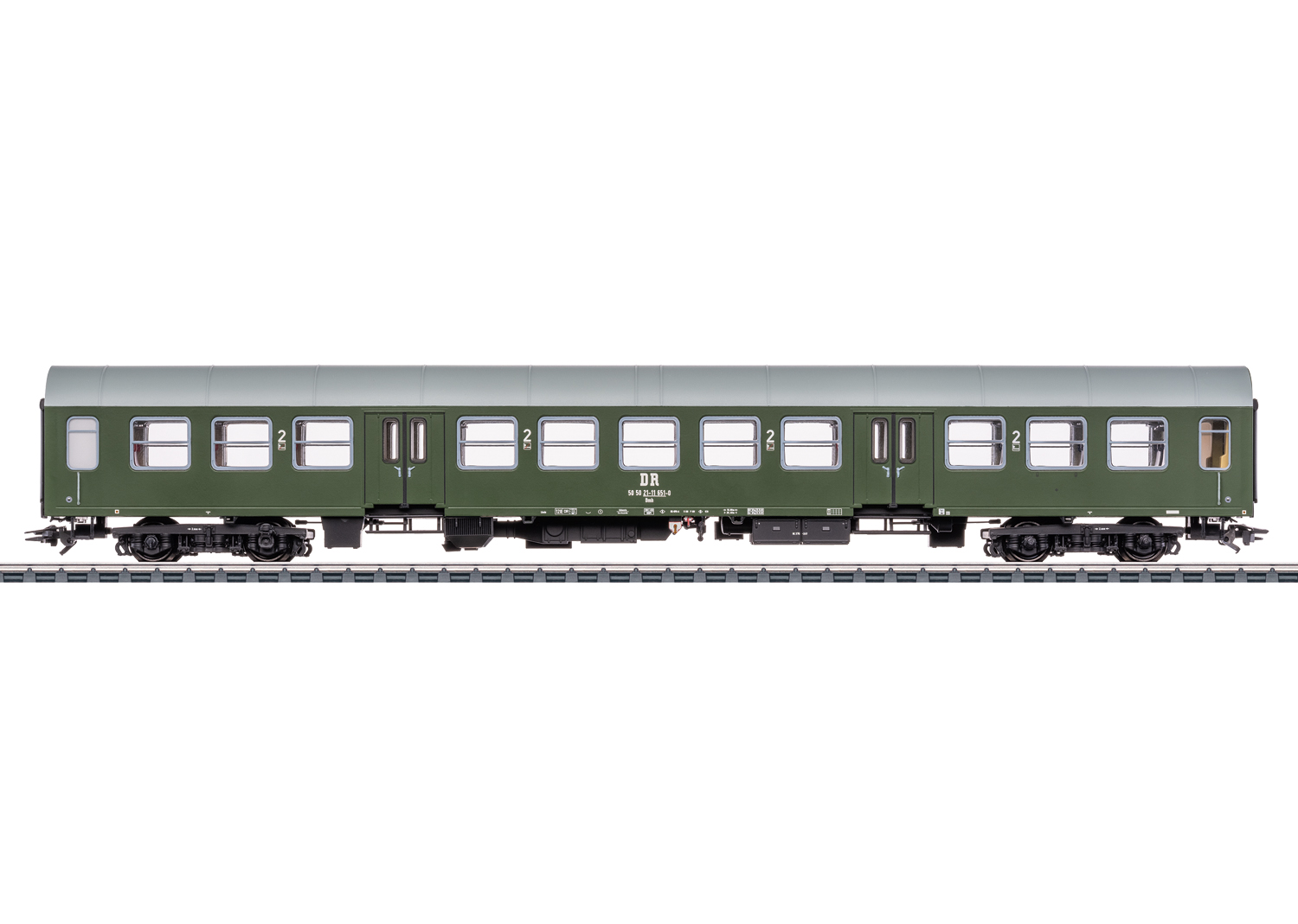 Prototype: German State Railroad (DR/GDR) type Bmh passenger car, 2nd class. "Halberstadt Center Entry Car" design in dark green (TGL 2233) basic paint scheme. The car looks as it did at the end of the Eighties.