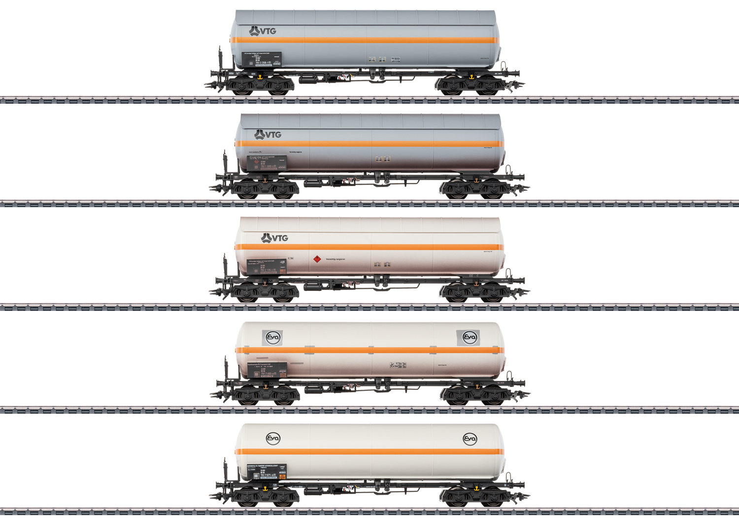 Prototype: Five 4-axle pressurized gas tank cars with and without heat shields. Privately owned cars for VTG, the United Tank Storage and Transport Service, Inc., Hamburg, Germany, with heat shields. Privately owned cars for Eva, Railroad Transport Service, Inc., Düsseldorf, Germany, without heat shields. The cars look as they did around 1984.